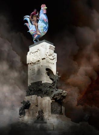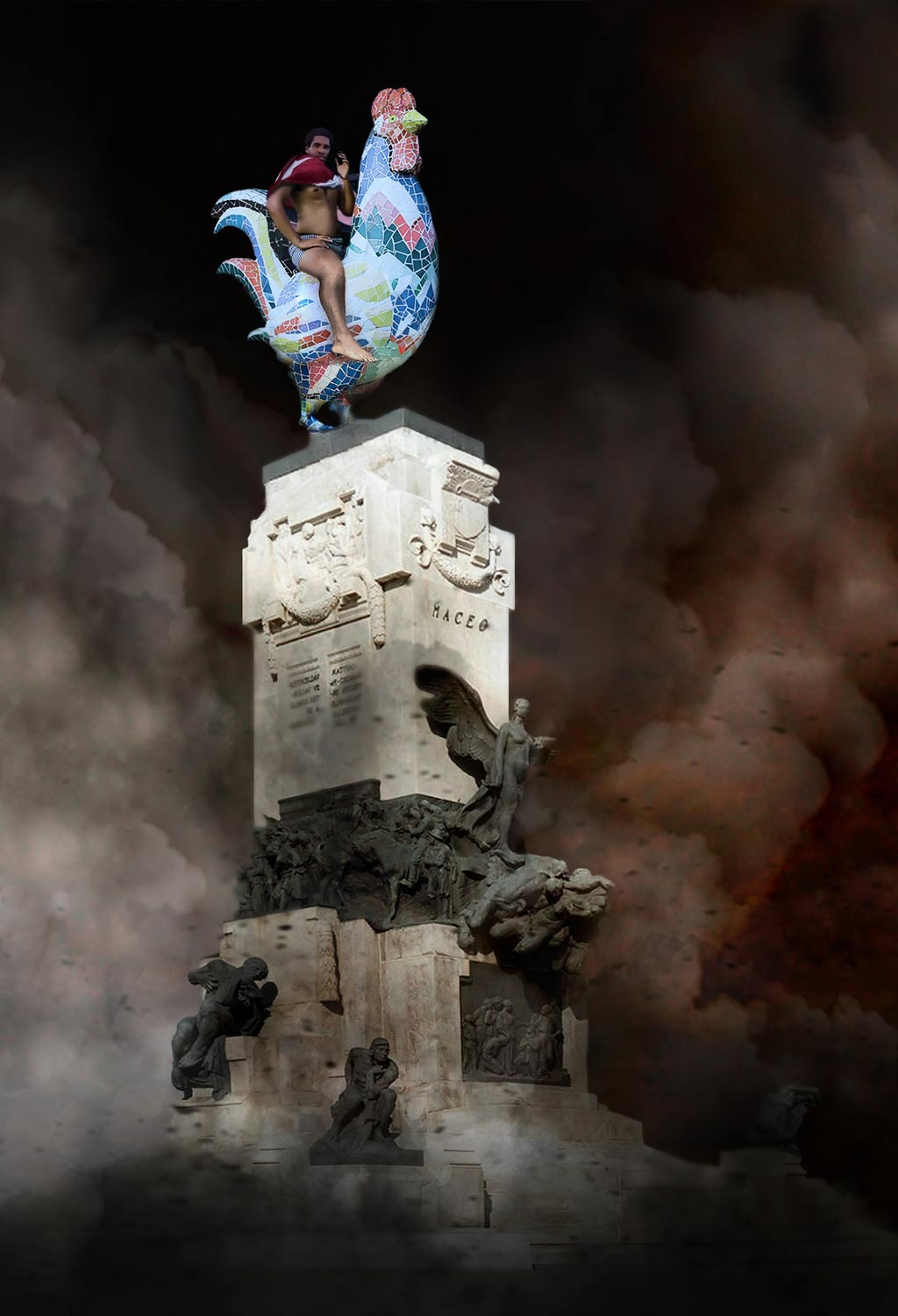 El gallo como símbolo ha tenido lugar en las más disimiles culturas y tradiciones. El gallo es el animal que vigila la salida del amanecer. Representa valentía, osadía, coraje y tenacidad. En la cultura cubana el gallo ha sido representado de disímiles formas tanto en la pintura como en la escultura, hay todo un círculo cultural creado además alrededor de las peleas de gallos incluso tiene un importante papel en la religión, sobre todo la afrocubana. En esta fotografía se observa a Luis Manuel Otero Alcántara, sobre una escultura de un gallo precisamente, que a su vez se encuentra sobre el Monumento a Antonio Maceo. Adentrándonos en el contexto esta obra fue concebida en el momento en que Alcántara se encontraba hospitalizado, luego de que su larga huelga de hambre fuera bruscamente interrumpida mediante una violenta irrupción policial en su residencia. El artista estuvo largo tiempo recluido en una sala hospitalaria, y se le negaba ser visitado por familiares o amigos, fue sometido a una constante vigilancia y contó luego haber sido medicado y casi torturado. En las pocas apariciones que tuvo en ese tiempo se le vio sumamente débil y perdido. En el exterior de esta situación la campaña por su liberación fue sumamente fuerte y en ella tuvo primordial protagonismo el movimiento San Isidro, del cual él es una de sus principales figuras. La composición de esta obra en forma de L, es una fuerte alusión a la libertad en todos sus sentidos como principal reclamo de la antidictadura cubana, y además hace referencia al gesto de una L con la mano, que caracteriza al anteriormente mencionado movimiento. Alcántara se muestra en esta obra como un Titán, un Maceo moderno, símbolo de valentía y liderazgo.