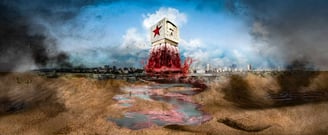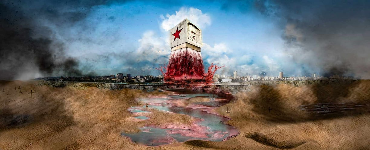 En esta fotografía Cuba ha perdido todo, incluso la abundante agua del mar que la rodea; se alza sobre el emblemático malecón y sobre la ciudad un monumento. El monumento a Abel Santamaría que originalmente se encuentra en Santiago de Cuba, del cual se observan dos de sus cuatro caras: la estrella solitaria y el rostro de José Martí. Martí ha sido colocado como autor de todo lo que se hizo y se ha hecho en Cuba desde el asalto al cuartel Moncada, del cual Fidel lo nombró, su autor intelectual. Es fácil asumir para los que no conocen su obra que Martí y Castro tenían las mismas ideas revolucionarias. El Partido Comunista de Cuba identifica a la Revolución como martiana y marxista, Fidel Castro otorgó la Orden Nacional José Martí a renombrados asesinos y dictadores como Saddam Hussein, Nicolae Ceausescu, Kim-Il-Sum, Janos Kadar y otros. Sin embargo, Martí no pudo simpatizar con el socialismo ni con el comunismo pues amaba la libertad y la propiedad privada y se oponía al totalitarismo y la arbitrariedad. Temía la concentración del poder político y económico en un grupo de personas que por naturaleza humana tendrían privilegios que abusarían al tener en sus manos la distribución de las riquezas. Martí escribió: “Dos peligros tiene la idea socialista, como tantas otras; el de las lecturas extranjerizas, confusas e incompletas, y el de la soberbia y la rabia disimulada de los ambiciosos, que, para ir levantándose en el mundo, empiezan por fingirse, para tener hombros en que alzarse como frenéticos defensores de los desamparados”, estaba informado sobre el socialismo gestante, era un lector prolífico y además escribió en varias ocasiones sobre el tema. Así, desde la altura, en esta imagen Martí sepulta con dolor los restos de la nación que soñó libre. Esta fotografía a pesar de su carácter solemne está cargada de movimiento y dinamismo. Resalta entre todo el ocre del polvoriento entorno desértico en el que se alza, el rojo vivo de la sangre que se derrama, acentuando el dramatismo del elemento y situando toda la atención en esta figura central. En el monumento original, la columna de agua que lo sostiene representa los ideales de los jóvenes que conformaban la Generación del Centenario, la mayoría murieron antes del 59 y sacrificaron sus vidas por un país que prometía ser mejor, esta sangre y la de todos los que murieron en la lucha por la soberanía es la que sustituye la columna de agua en la foto, sangre derramada en vano y a la que se han sumado todas las víctimas de la dictadura.